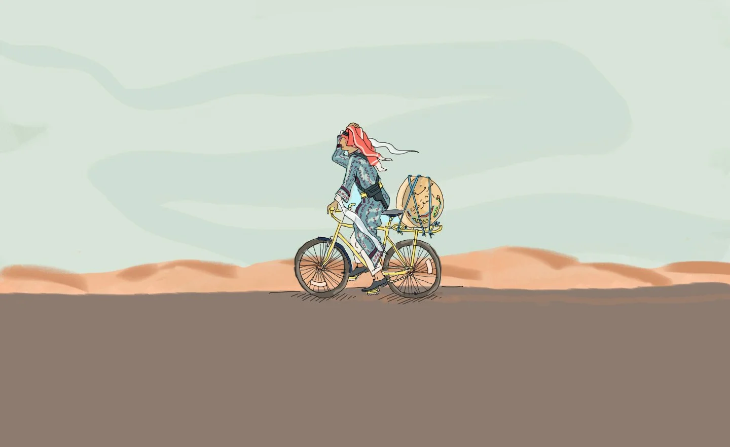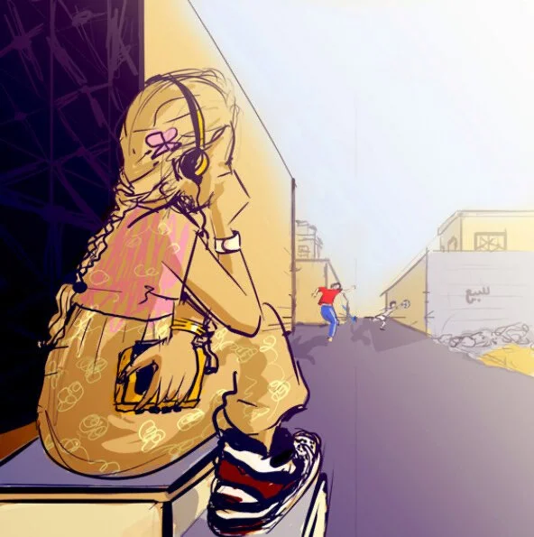 Historically, women have been connected to the land, whereas men were constantly moving and traveling for various purposes. This idea shaped and perpetuated women’s immobility and deepened their connection to the land, without consideration to whether this connection was created by force or not. Personally, I was very active as a child. I used to run and play football when my family lived in the US, but these hobbies were constricted when we moved to Riyadh, simply for being a girl. I shed light on such memories in my work — I drew myself in my first digital illustration as a kid sitting on our house doorsteps, watching other boys playing football barefoot. At that moment, we inhabited the same space. However, that space enforced constrictions on me that the other boys survived.