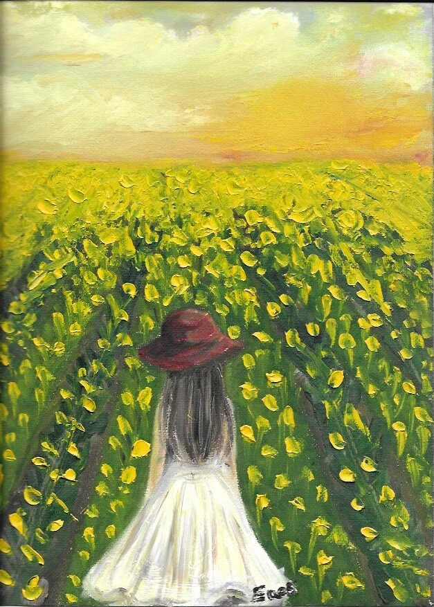 كتبت إناس قصيدة تصف الحالة التي مرت فيها خلال فترة الحجر الصحي الماضي بسبب انتشار فيروس كورونا. رسمت هذه اللوحة لتشارك القارئ المنظر الطبيعي الذي كانت تحلم به وهي تكتب تلك القصيدة.